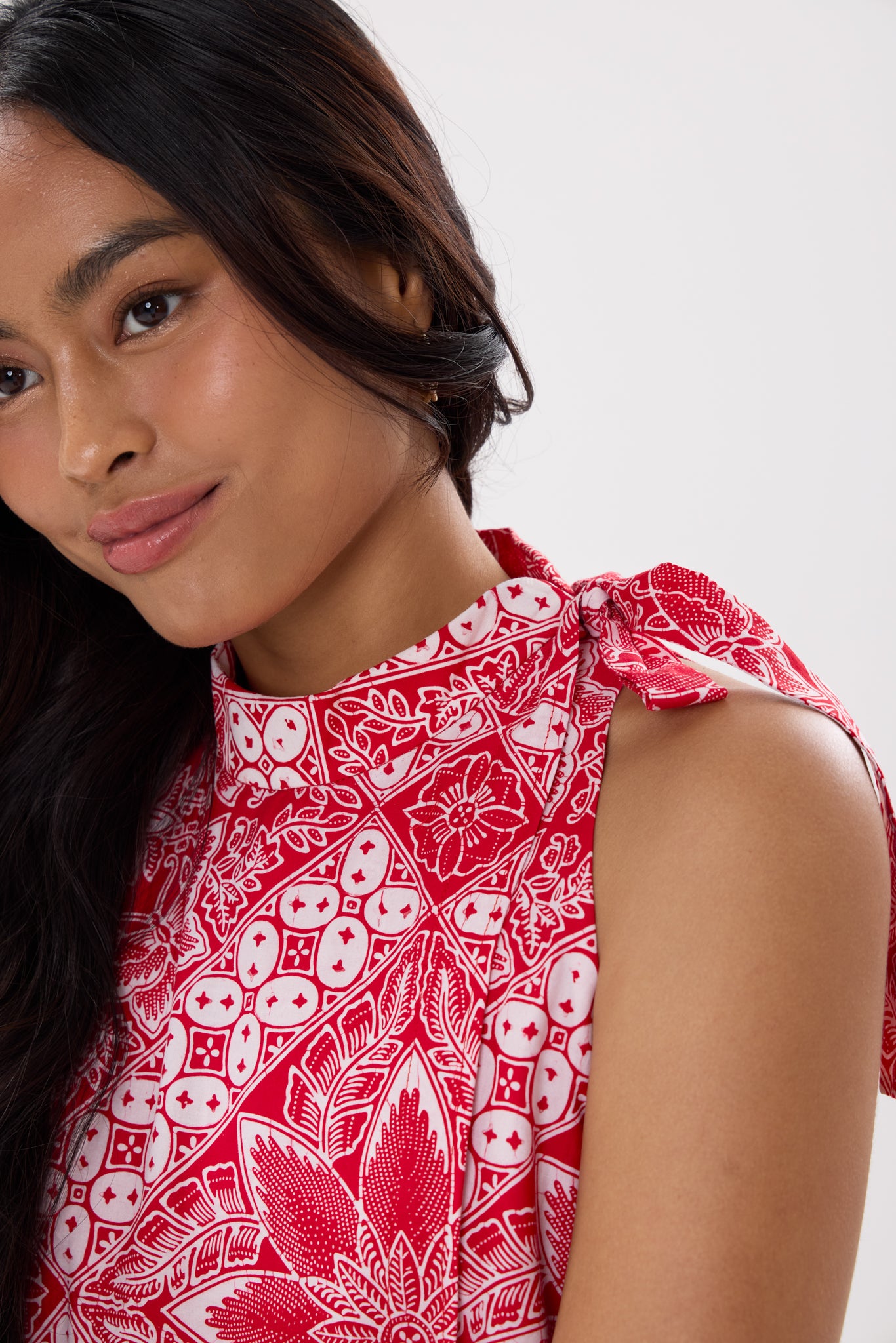 - Ribbon detail on the shoulder with faux overlap front design